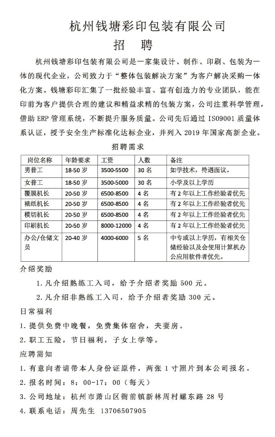 2、提升地方竞争力:通过招工,衙前地区的企业可以吸引更多优秀人才,提升地方产业的竞争力,人才的聚集将进一步推动衙前地区的科技创新和产业升级。